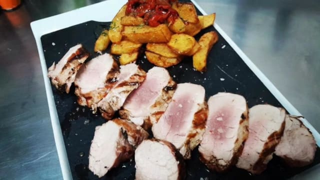 Solomillo al carbón con salsa y guarnición