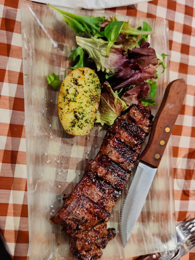 4/10He recommended the local marinated pork steak, when I asked about the portion size, he clearly told me and even showing with his hand that it's a generous portion. My child's plate came, but due to our mistake we did not request to simply plate the mushroom ravioli 'alone' therefore we ordered another one simply with just the ravioli. Meanwhile my wife and I eat the ravioli which could not have the sauce and condiments removed due to my daughter's eating habit. After the starters my so called steak was served. A glad piece of meat 5mm thick and around 6cm x 20cm 'no joke'. Next to me people where served meat steaks of 2cm thickness and bigger size! However the major problem was my wife which was suffering from tummy ache to a point that we did not have deserts and had to leave the place. But upon leaving and paid I asked the server about the actual filling of the ravioli and he confirmed that the filling was a mix of mushroom, mixed meat!!!! That is grave! Especially since my wife does not eat meat!!