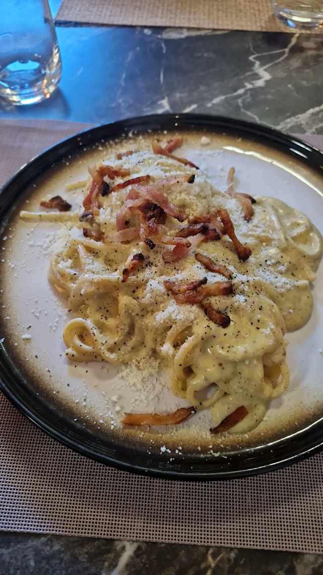 Spaghettone cacio e pepe con tartare di gambero rosso e zest di lime