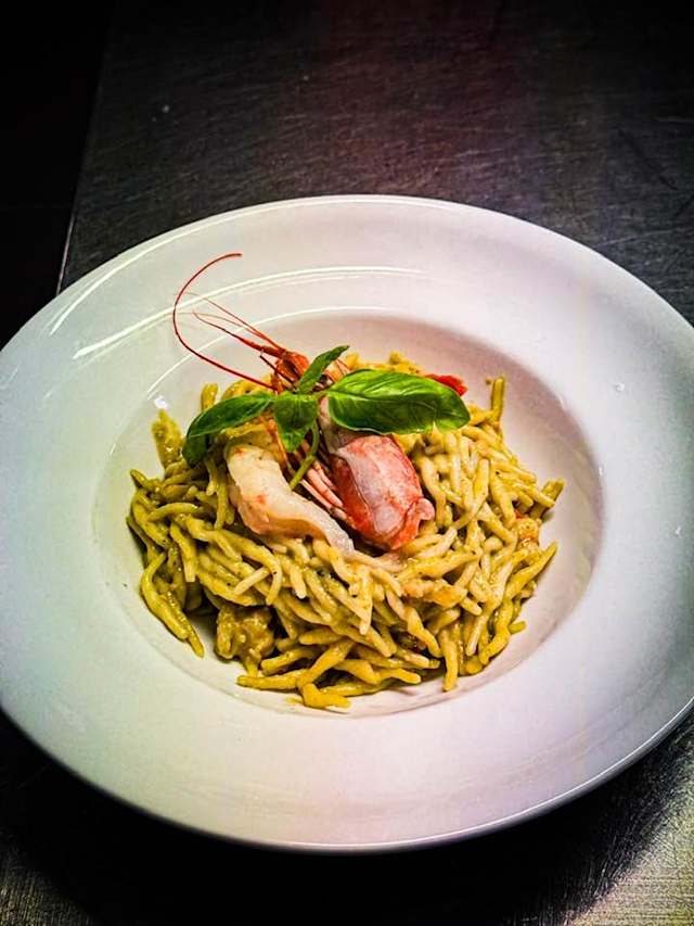 Salsa di pomodoro, mozzarella di bufala, gamberetti e pesto