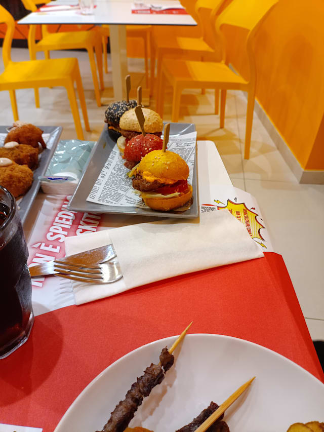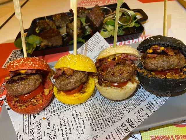 4 Mini-bun con mini-burger, pomodoro, cheddar, bacon e cipolla croccante.