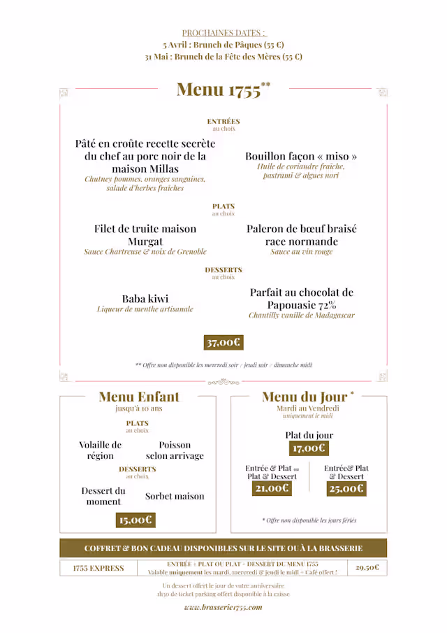 Brasserie 1755Chère Madame, Cher Monsieur Nous remercions chaque personne pour l’engouement qu’elles témoignent envers notre maison. Les équipes y sont très sensibles et lisent avec attention chaque commentaire que les clients prennent le temps d’écrire. Nous recommandons à la clientèle de lire plusieurs avis afin d’avoir une idée précise sur notre établissement. Toute l’équipe se réjouit de vous accueillir prochainement, L’équipe de la Brasserie 1755