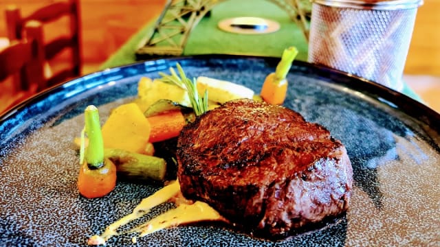 Pain traditionnel de l'île de Madère "Bolo do Caco" fait Maison, steak haché de Bœuf Simmental sur un chutney d'oignons rouges et fromage au choix servi avec de frites "Maison", sauce "Café de Paris" et légumes du moment. Options Supplémentaire: - Au Gruyère AOP - Fromage à Raclette - Maroille - B