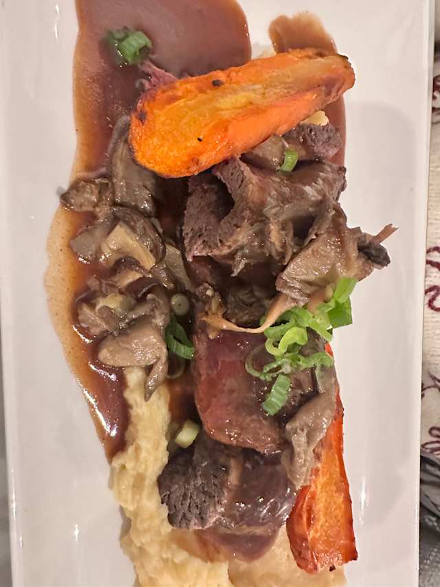 - façon Bourguignonne mariné au Gamaret, pleurottes et carottes confites, mousseline de pommes de terre