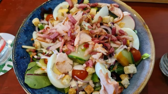 Groene salade met kip, ei, croutons, spekjes en caesar dressing.