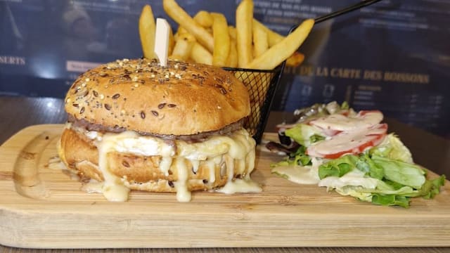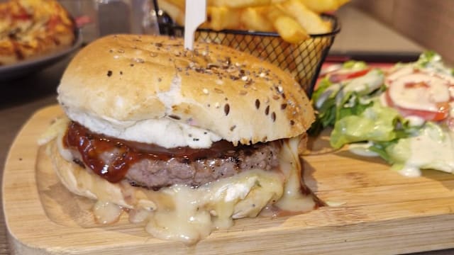 - Viande de bœuf hachée (env. 150g ??), saint-marcellin, sauce BBQ, frites et salade.