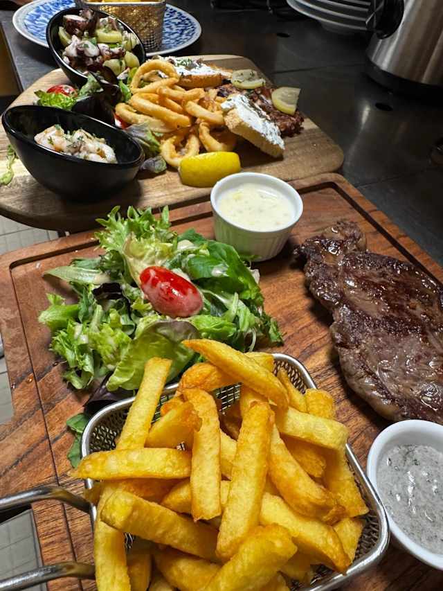 - Poulpe grillé, citron confit, calamars frits, crevettes marinées à l'ail et au persil, salade de poulpe, pomme de terre, tartine crème de ricotta anchois