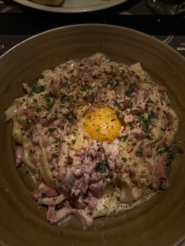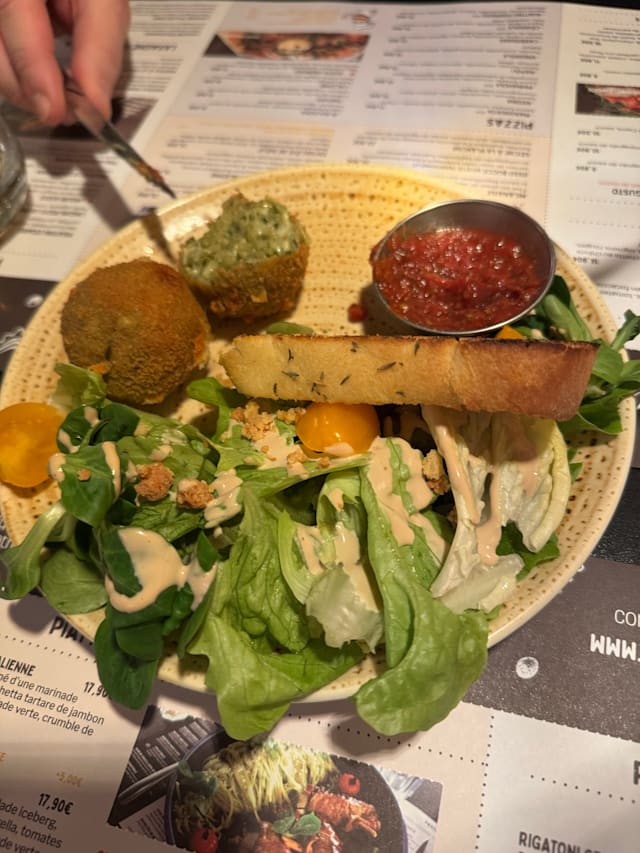 Avec de la mâche, savoureux, maison. Frites fraîches, pancetta grillée, marinade d'olives taggiasca, jaune d'œuf, pain focaccia, salade verte