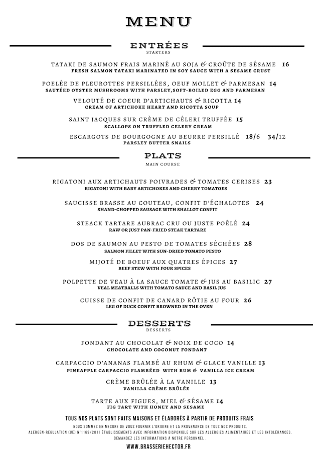10/10+4Today is our first night arriving in Paris from London, and we are truly delighted to enjoy such delicious food at Brasserie Hector. The cuisine here is far superior to that of restaurants of the same level in the UK. Simply put, the dishes in this restaurant are of outstanding quality, leaving us with a wonderful impression of our first day in Paris.