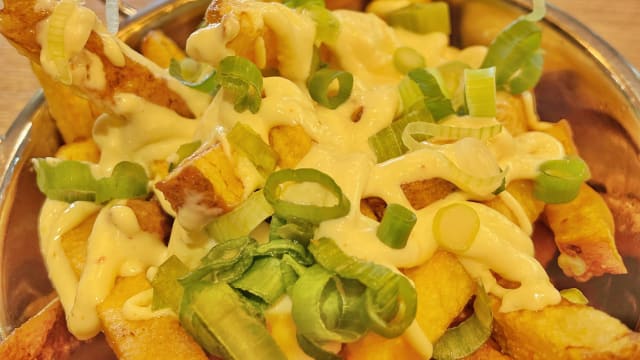 - Pommes de terre square, la vraie sauce poutine québécoise, cantal jeune, sauce cheddar, cébette, oignons frits