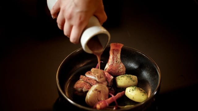 - Filet de bœuf flambé au chalumeau, nappage vin rouge et ciboulette