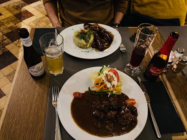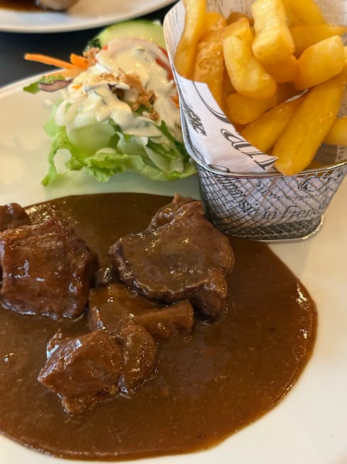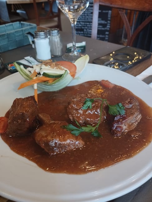 5/10The main (carbonnades) was really good, and a good portion too. It came with chips, crispy salad and a rich sauce. The dessert (tart tatin) was not so good, and the ice cream was already melted on the plate. The service was a bit lacking as the man seemed to be very rushed despite there not being so many people dining. The woman was kinder and always had a smile on her face, which was nice to see. The ambience could have been improved as the furniture is old and the room feels like it could be with some touching up. We booked with a 20% discount on food but this was only applied to the mains, not to the dessert. I later checked the rules on The Fork and found out that desserts should be part of the deal too, but it was too late to complain.