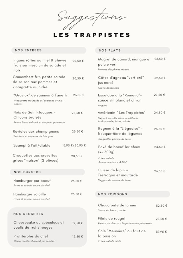 10/10A Must-Visit Traditional Gem in Brussels! 🇧🇪 This was my first time in Belgium, and my very first dining experience in Brussels was at Les Trappistes - what a fantastic introduction to the local cuisine! This restaurant embodies authenticity, offering outstanding traditional dishes that truly capture the essence of Belgian flavours. The two waiters who served us were absolutely lovely - kind, attentive, and passionate about their food. They even offered us a taste of their incredible tartaar, a local delicacy that this restaurant seems to master perfectly. It was a delightful and unexpected gesture that made the experience even more special. Despite the grey skies outside, this warm and welcoming restaurant completely brightened our trip. If you’re in Brussels and looking for a place that serves excellent traditional food with genuine hospitality, Les Trappistes is a must-visit! 🖤♥️💛