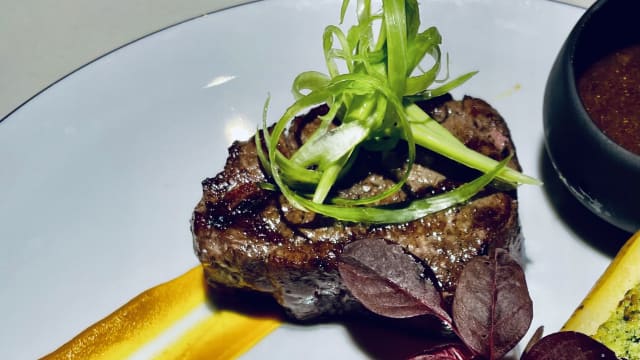 Filet de bœuf/ beurre d’anchois/ sauce au poivre vert/ poireaux rôti