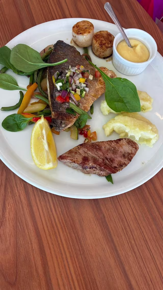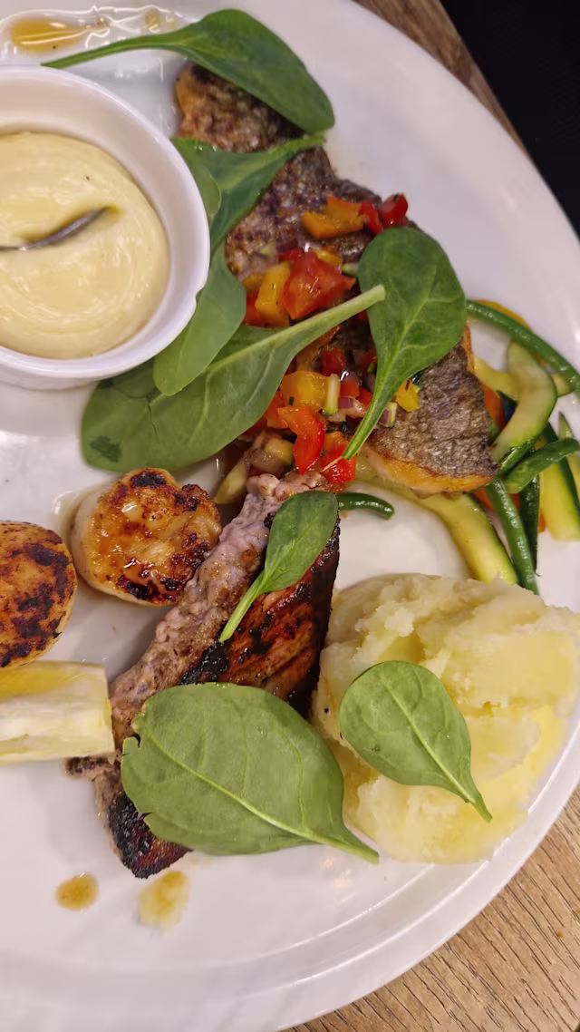 - Filet de daurade de méditerranée, steak de thon, st jacques snackées purée maison, légumes de saison grillés, sauce aïoli