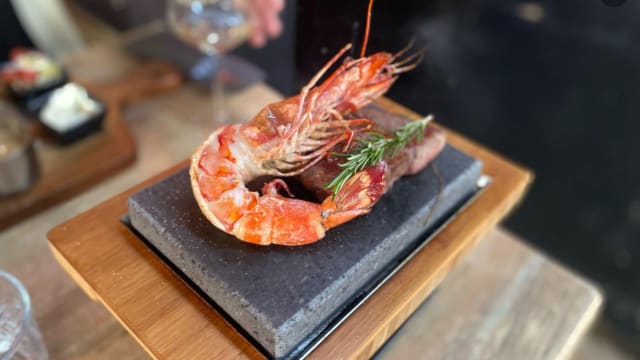 Grote black tiger garnalen in de knoflook olie gemarineerd met brood & aïoli geserveerd in een pannetje op een hete steen