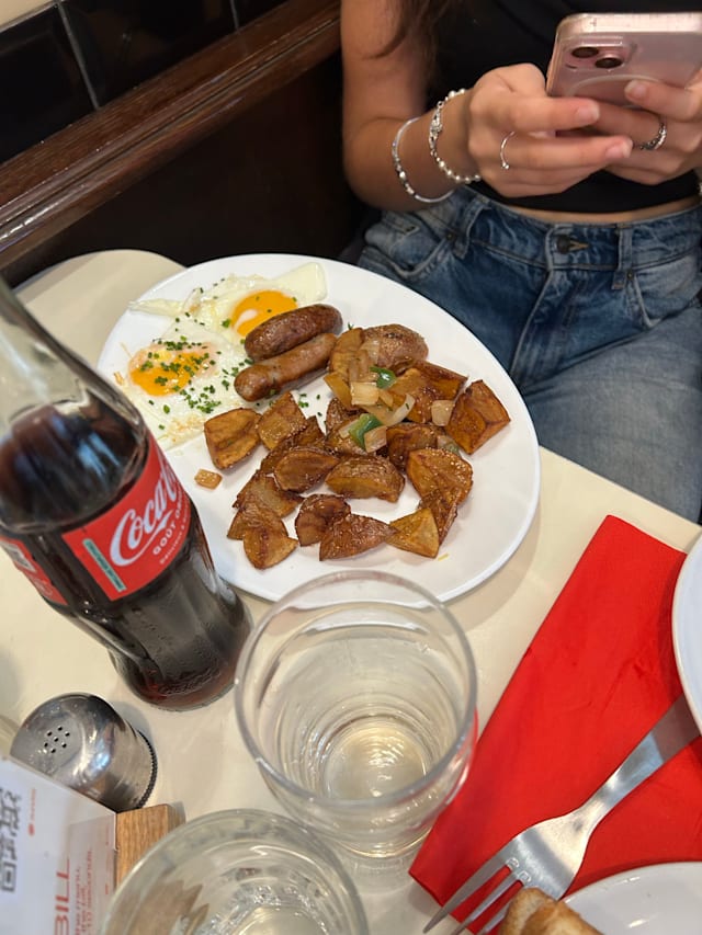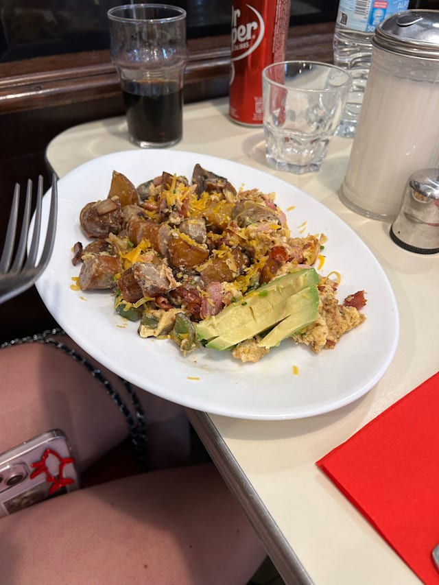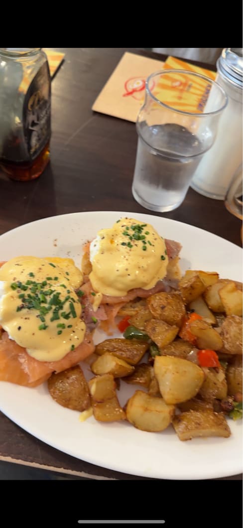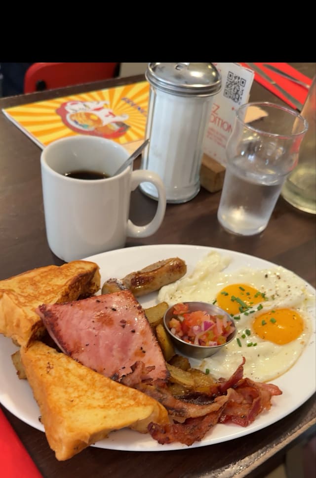 6.5/10The waiter was very kind, and the atmosphere is like a 1950's diner. The food, as I find in most breakfast restaurants, was mediocre at best. The bacon was overcooked (some of it was burnt), and the potatoes were excessive and rather boring. The bread was white, and I was not offered a healthier version.