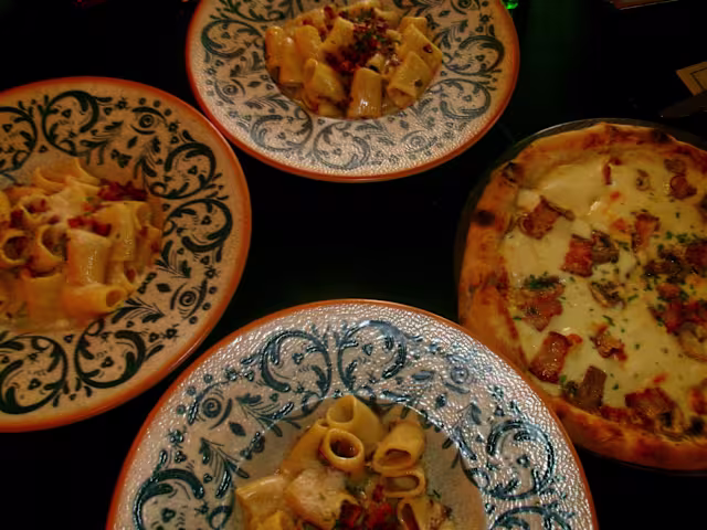 - Rigatoni com pancetta romana fumada, creme de parmesão DOP curado de 24 meses, trufa preta, queijo pecorino romano, pancetta crocante, salsa fresca e pimenta preta.