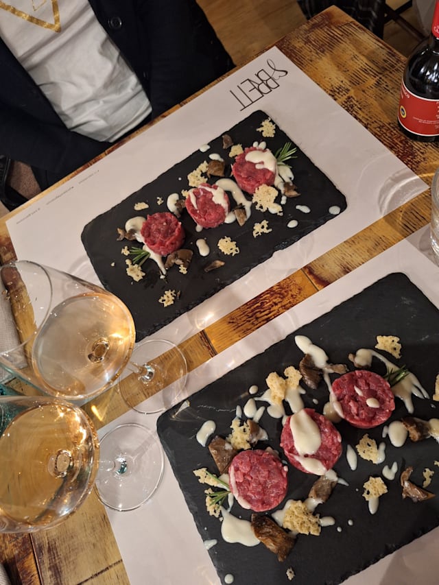 Tartare di carne salada al coltello, mela, grana, capperi e perle di aceto di mele