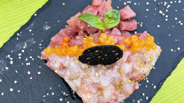 Tacos di grano tenero con tartare di salmone e di gambero, guarnita con zest di limone e caviale di salmone