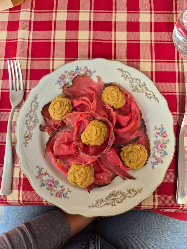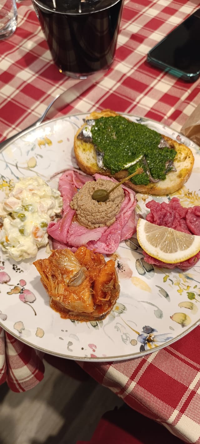 Antipasto misto con carne cruda, insalata russa e peperone con bagna freida