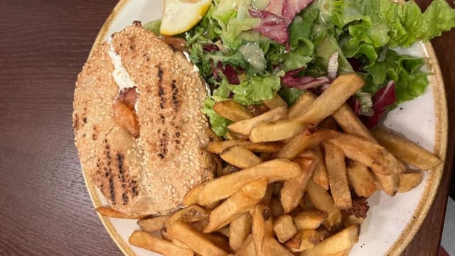 - Bun, ketchup, moutarde, cheddar, oignons, cornichons, guacanole, sauce menthe et tahini, palatels