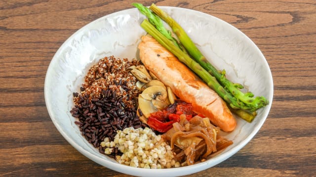 Rúcula, cebada, aguacate, tomates cherry, parmesano, pistachos, albahaca y vinagreta de mostaza