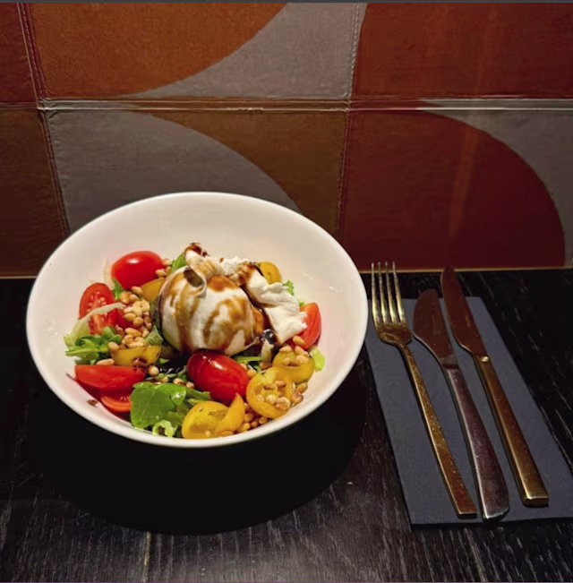 - Burrata, kerstomaatjes, basilicum, pijnboompitten, aceto balsamico
