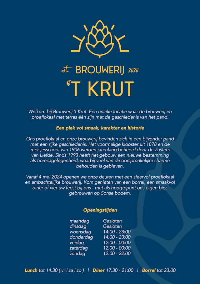 Aan de Nieuwstraat 6 in Son zijn we begonnen in het pand van de voormalige chinees See Hoo. In de toekomst wordt het pand gesloopt en herbouwd. Nu kunt u er 5 dagen per week genieten van unieke en mooie bieren, perfect geserveerd door bierambassadeur en biermeester Allard Pos. Voor ons staat gezelli...