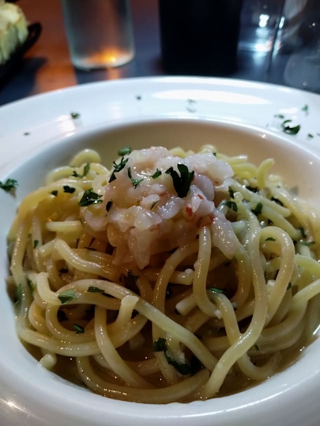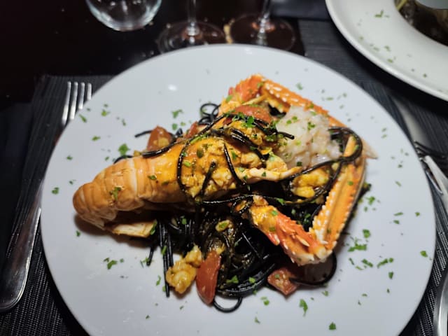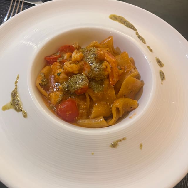 7/10Amoung 4 dishes only one was really good. Pasta with pumpkin, sausages and mushrooms and another one with pistachio and shrimps were just usual, can't even say that tasty - pretty plain taste of mushrooms in first one and strong shrimp flavour in second, so other ingredients were just lost. Fish antipasti was strange, like fish cutlet (even with couple of small soft bones), bean puree also was lost in this fish background. The desert was ok, actually nothing special, just good quality lava cake, by the way I didn't understand why lava cake is called "warm pudding" in the menu. The service was good, though we were informed that gnocchi are not available after we already ordered it.