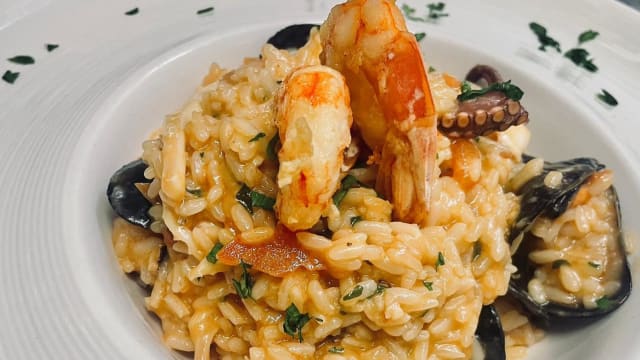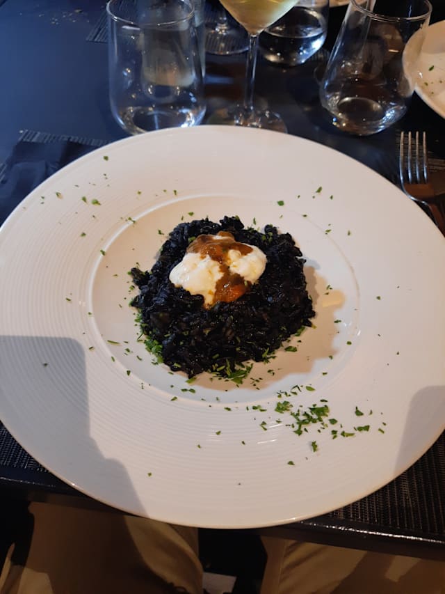 Riso carnaroli al nero di seppia mantecato con burrata e ricci di mare a crudo