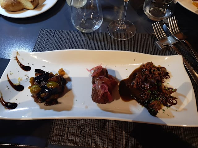 Cubotti di tonno scottato servito in tre interpretazioni: con panatura al sesamo, panatura al pistacchio e con cipolla rossa caramellata in agrodolce