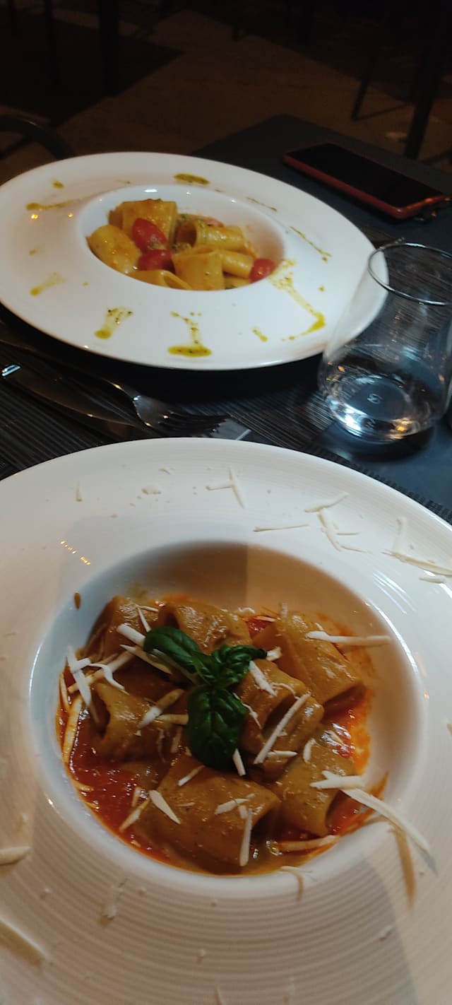 Paccheri con crema di melanzane salsa di pomodoro e scaglie di ricotta salata
