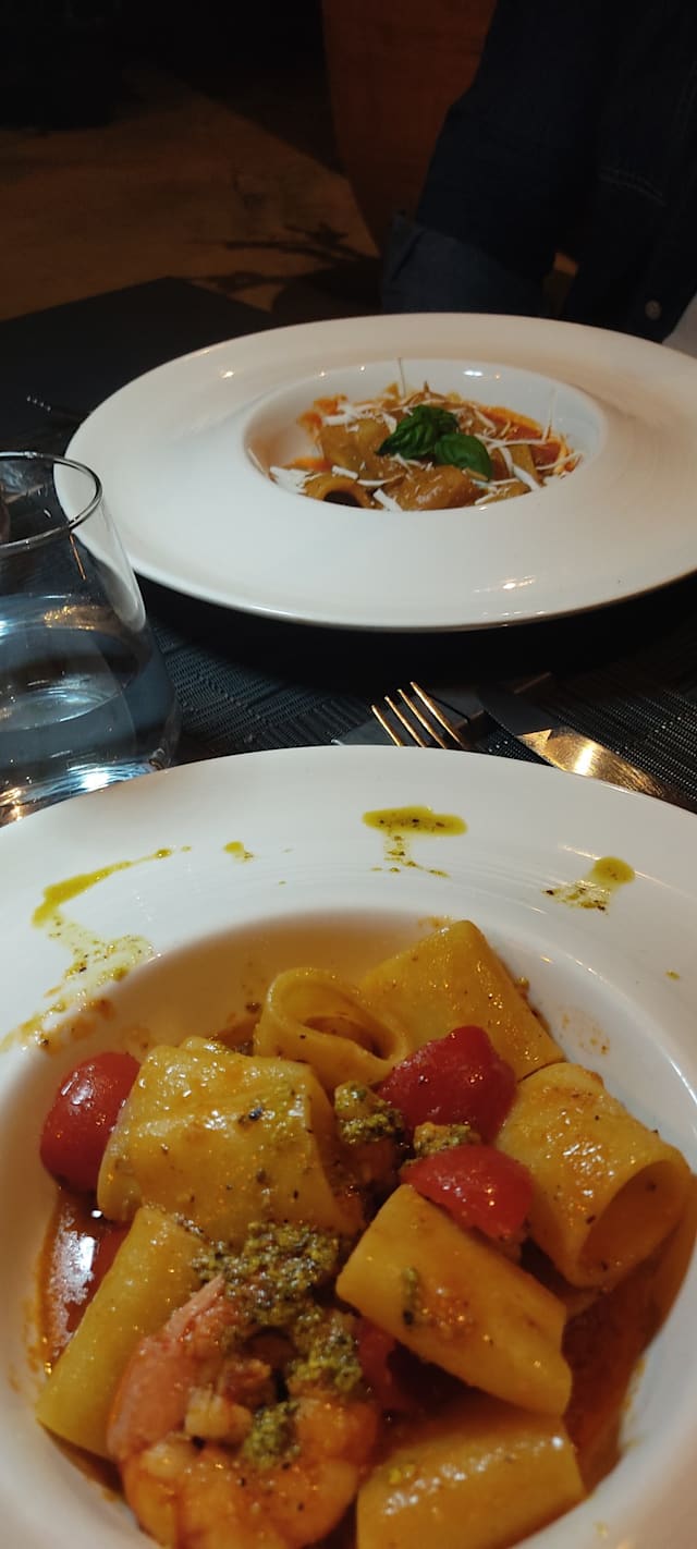 Paccheri con crema di pistacchio, gambero e pomodorino