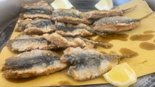 Anelli di calamaro, gambero e calamaretti infarinati e fritti accompagnati da salsa dolce e piccante