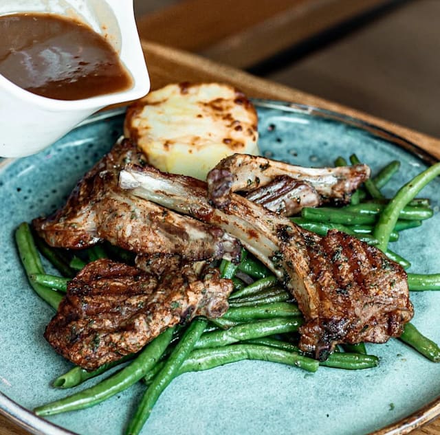 Huisgemaakte pure rundsteak burger, cheddarkaas, gebakken champignons, gekarameliseerde uien, huisgemaakte chefsaus, groene salade en augurken. Bij al onze burgers krijg je frietjes.
