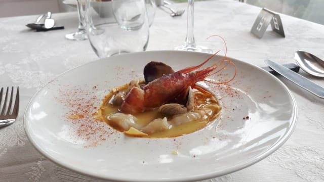 - Arroz de variedad dinamita con codo de marisco casero salmoreta, gambas rojas y calamares de l lonja