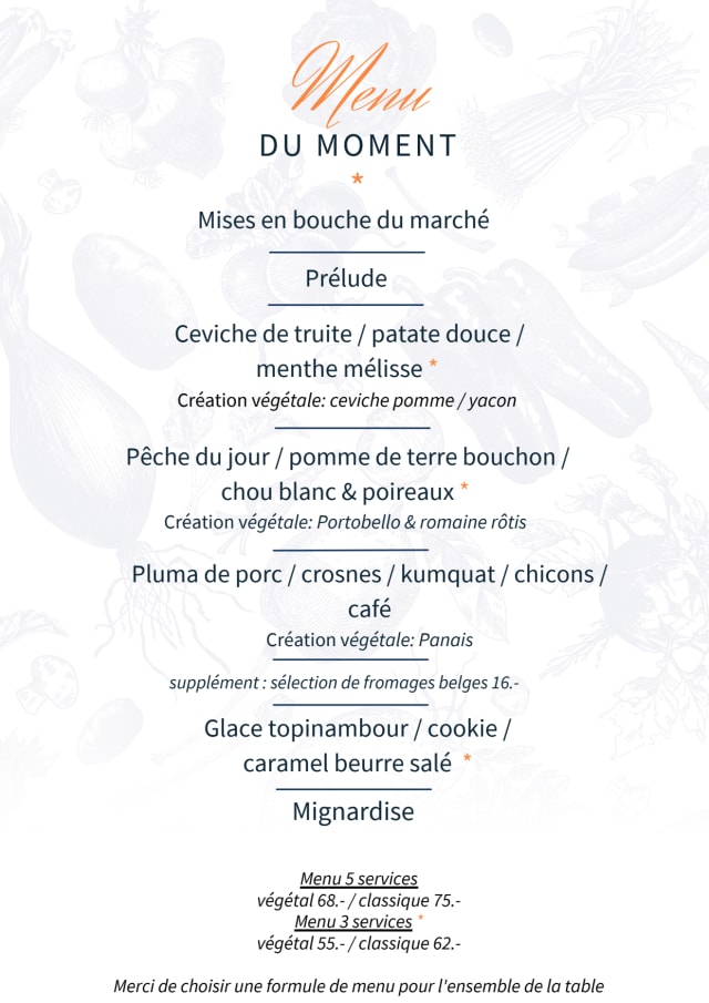 Menu en 6 temps (prot. animale en supplément)€64 per guest