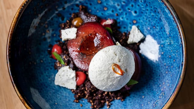 - Prune Pochée Au Sirop De Romarin Crumble Chocolat Sésame / Meringue Romarin