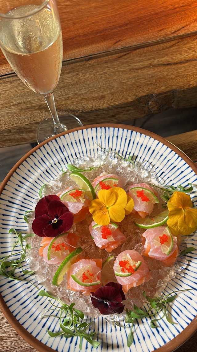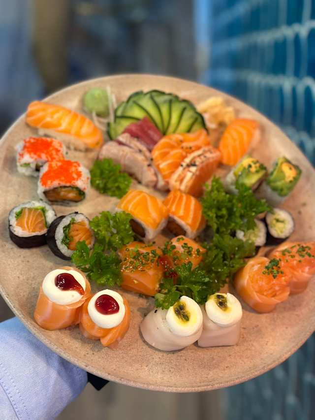 - Finas fatias de salmão e peixe branco, regadas com molho especial do chef, e ovas de massago