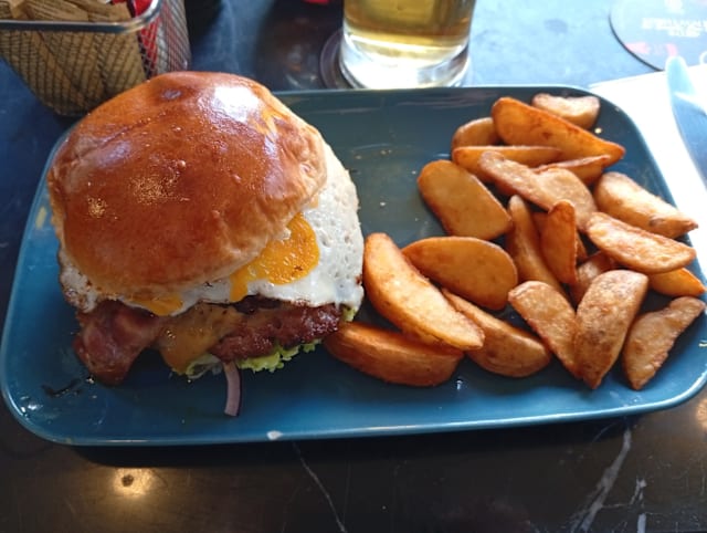 Doble smash burger de 160gr, acompañada de mahonesa de bacon, queso cheedar, y una fina capa de bacon caramelizado, pan brioche, acompañado de patatas.