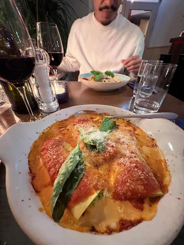 - Scampi och blåmusslor i tomatsås. Parmesan och basilika.