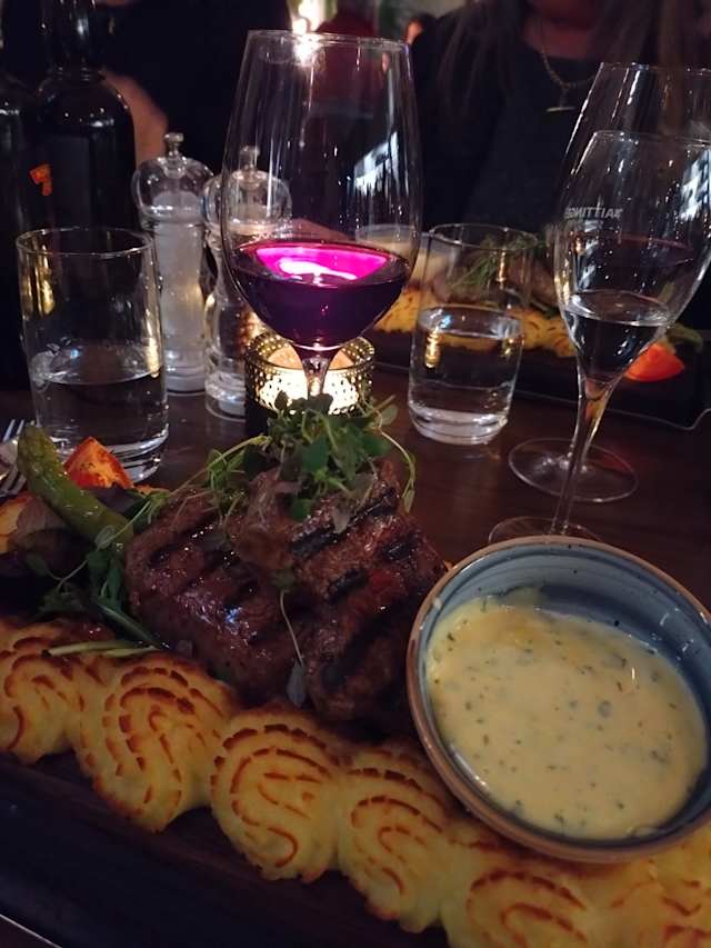 - Välj mellan ryggbiff, oxfilé eller entrecôte. Serveras med grillad tomat, sparris, rödvinsås och bearnaisesås.