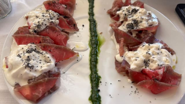 Pomodoro, stracciatella vaccina, frutta secca, ceci rapa rossa, frutta di stagione