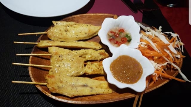 Kai satee (brochetas de pollo a la plancha marinadas en salsa de cacahuete y leche de coco)