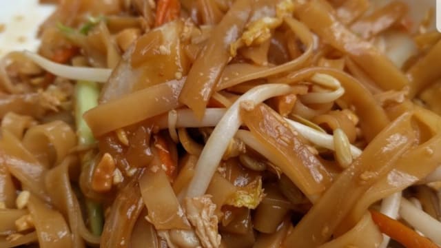 Pad thai sai khung (tallarines de arroz salteados con langostinos, huevo, cebolla, soja, verduras y cacahuetes con salsa de tamarindo)