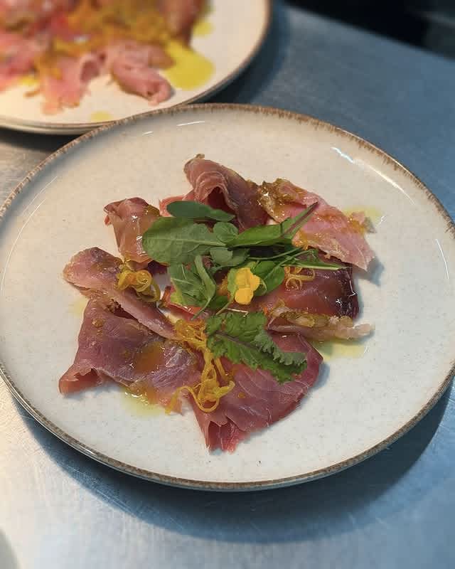 - Linguine con bottarga di tonno, burro allo zafferano e bucce candite di limone e arance