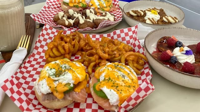 Jus, oeufs dur, fromage frais et gaufre en épis
