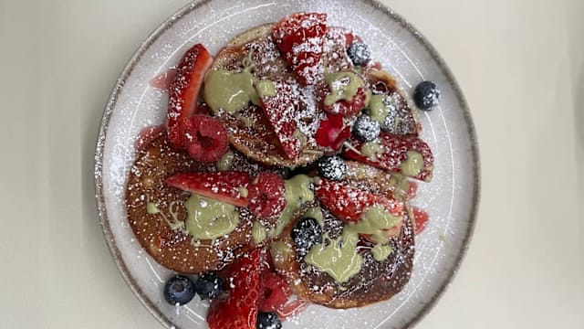 Cherbet citron, crêpe 1000 trous, huile d'olive et miel, œufs brouillés au fromage fetta
