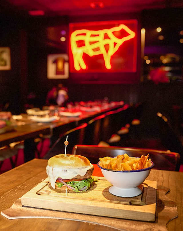 - Hamburguesa casera de angus argentino con lechuga, tomate y cebolla